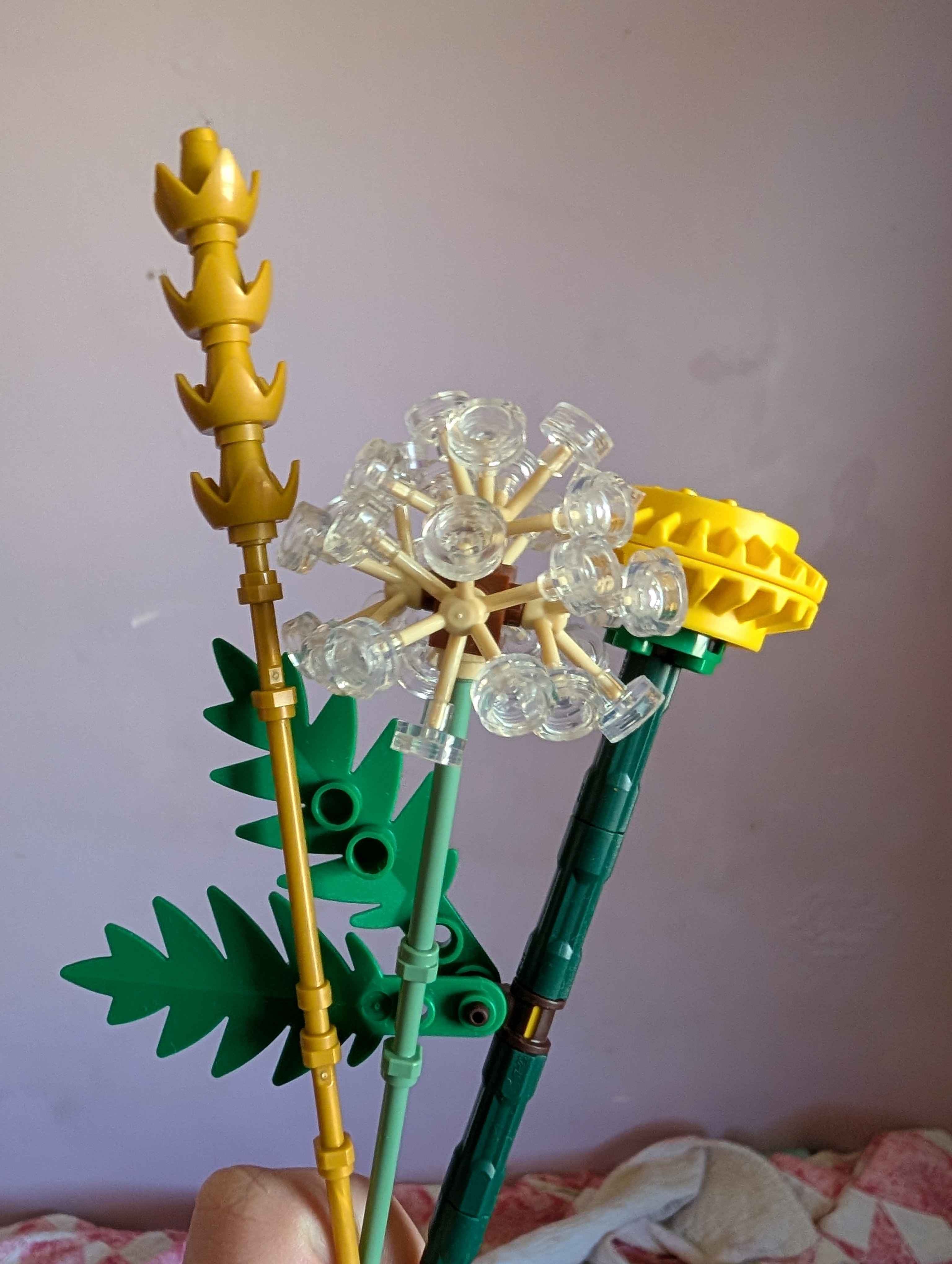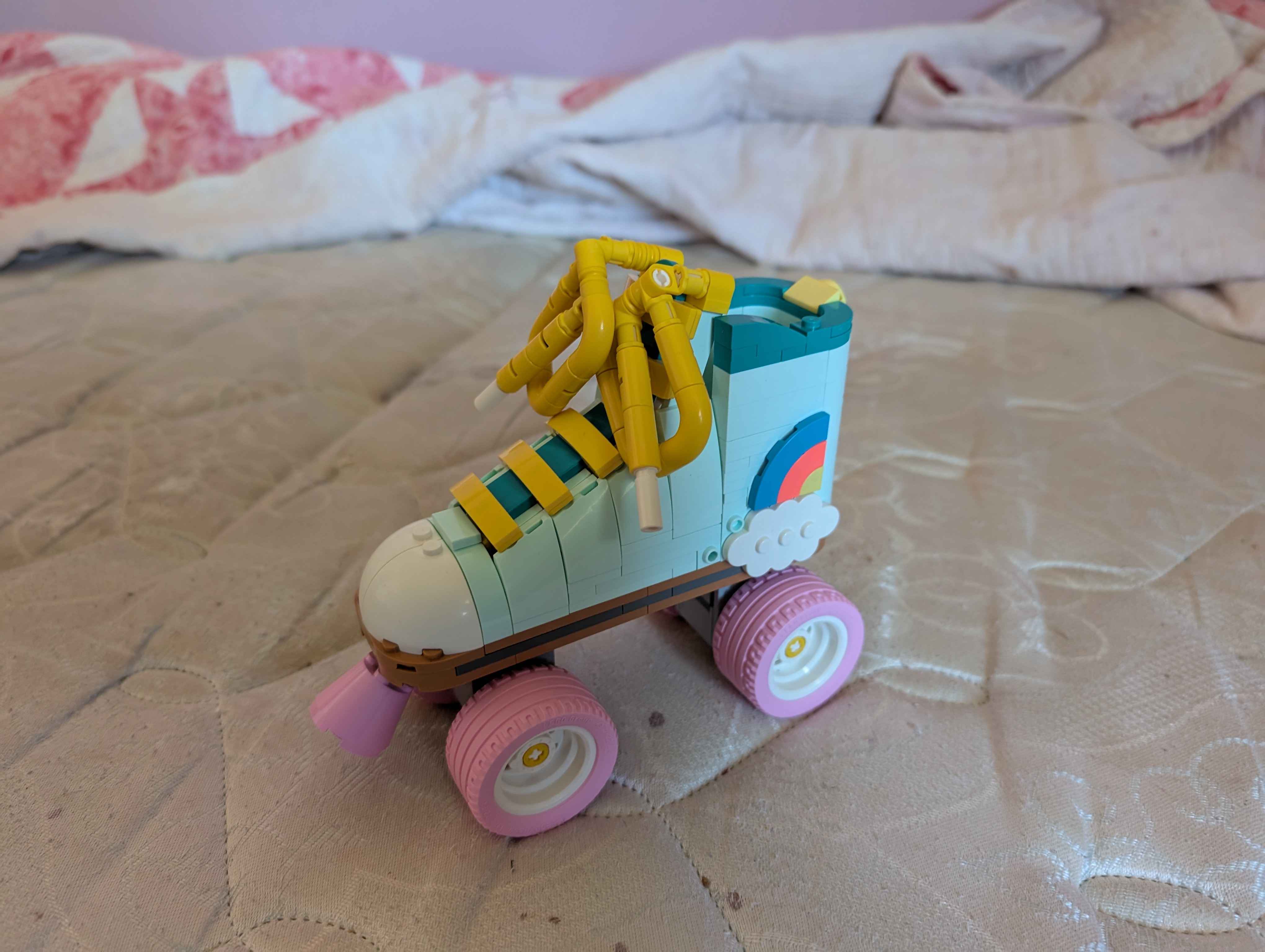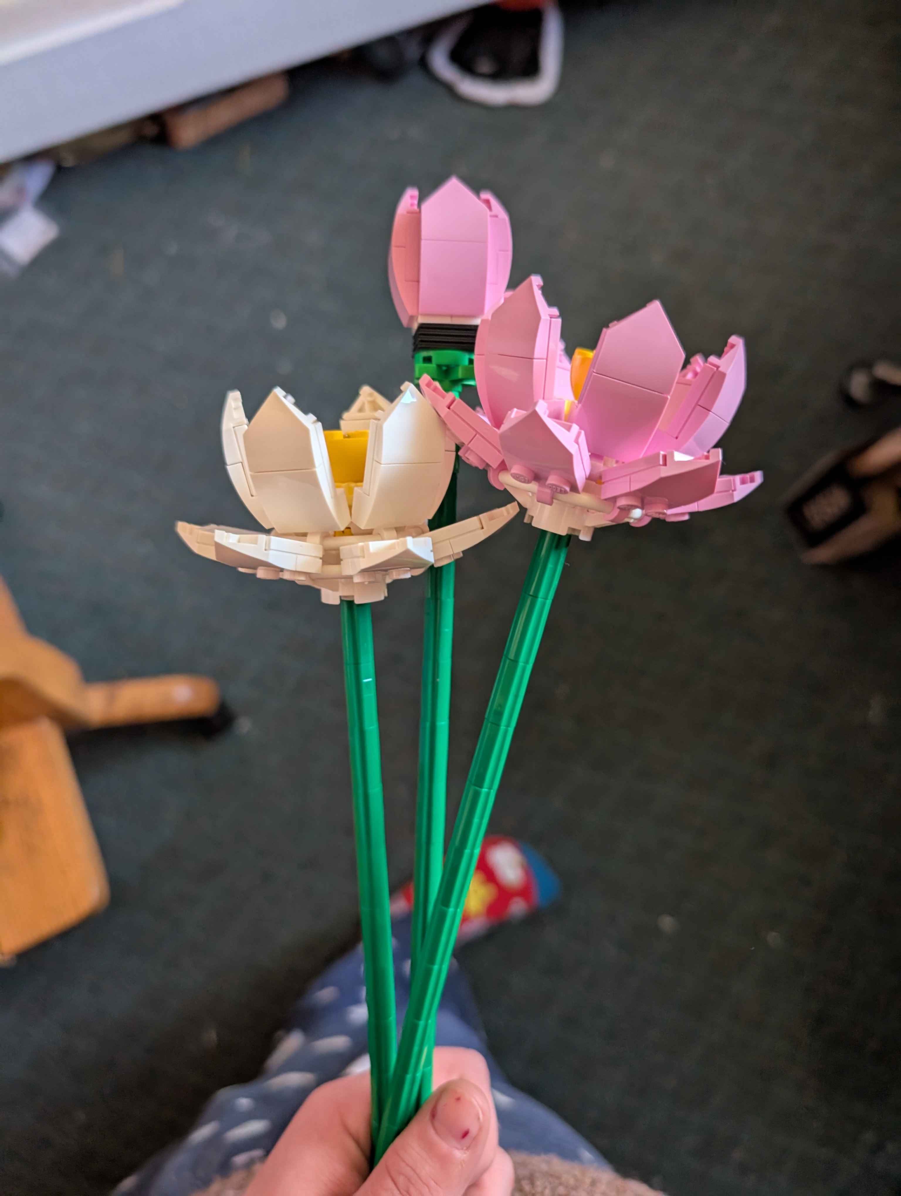 A grey camera with multiple functions, the top bits all spin and click into place.The inside of the camera, it swings open to reveal a set of film with a series of photos on it.Came from the same set as the camera, I like it because you get to display all the clear sticker bits.A better shot of the little television.My first ever set! The paper bit slides and spins, and the typewriter clicks like a keyboard.Came from the same set as the typewriter, hence the flowers.Didn't "properly" finish this one but I got the main bit and stand done, and thats enough for me.My fave floral build, displayed in a vinegar bottle in the living room.My first Animal Crossing themed set! I love it's simplicity and how it came with a minifig despite the size.The name of the minifig swayed me to purchase this one, IYKYK. I added little cherries to the tree for pizzaz.Camping set! I love how customizable this one is, and how the minifig looks like it is jumping.Another look at the Animal Crossing camping set.I love building and rebuilding this one, its my largest Animal Crossing set and came with many little pieces.Another shot of the house. A fun thing about this set is that you can change out the windows.The inside is also customizable! I love playing with the internal features.A friends brand flower set, my favorite part is the sunflower.A little dollar store racecar.This was tricky to build! It's my first technic piece, it came out a little weird, but I'm satisfied.TTTTTTTT